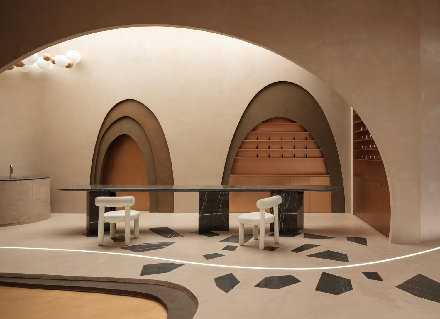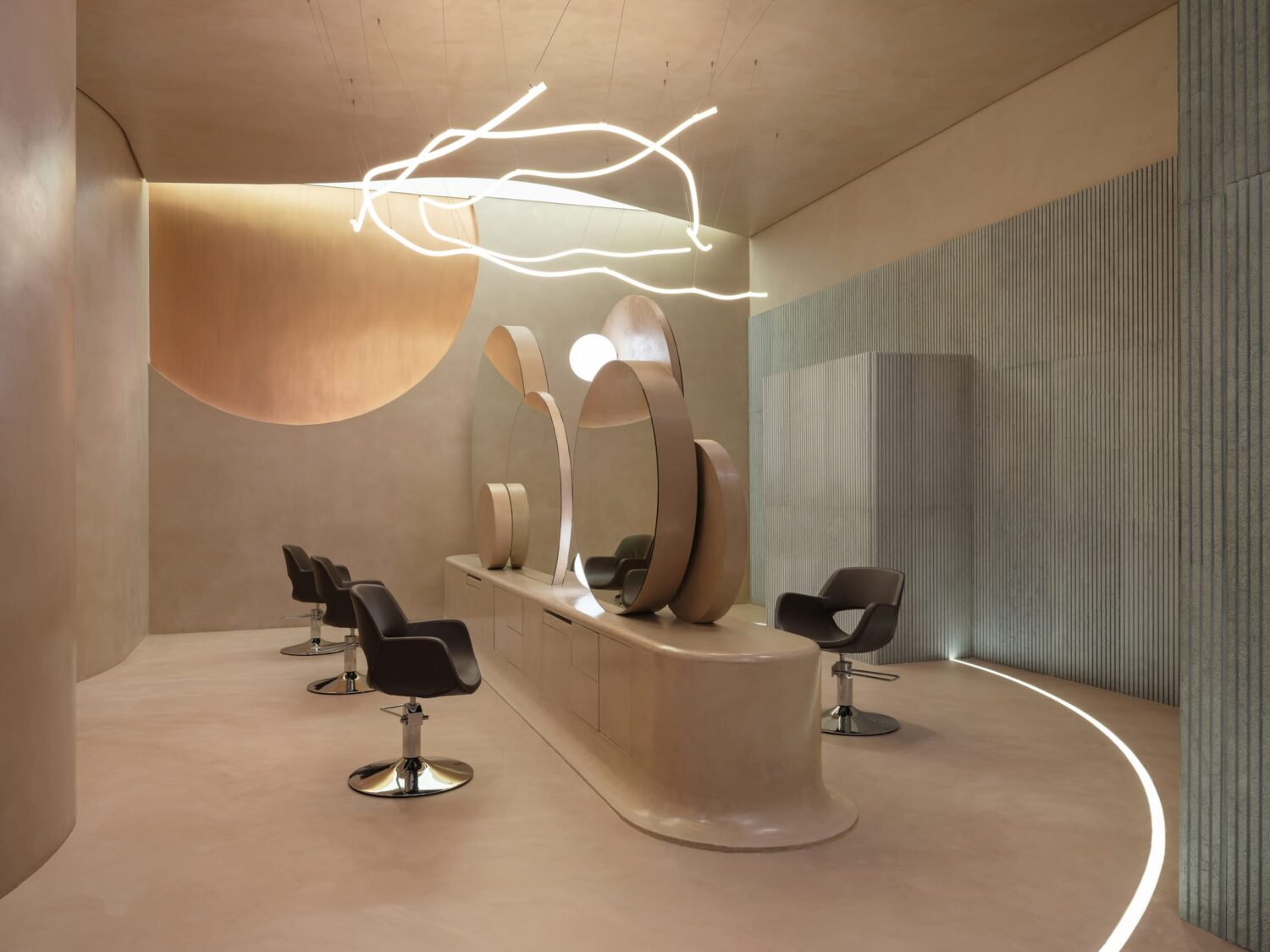 In Saudi Arabia’s capital Riyadh, Ark4lab of Architecture has turned a beauty salon into something unexpected. Stellar Beauty Salon reads more like a sculptural installation than a place to get your nails done—and that’s entirely the point.The concept draws from celestial themes, translating abstract astronomical concepts into tactile design language. Fluid curves and circular cutouts create a sense of movement and rhythm, while the colour palette—warm taupe through to muted bronze—wraps everything in a calm, otherworldly feel.Light is everything here. A large oval skylight floods the space with natural light, which bounces off the plaster surfaces and brings out their subtle sheen. Suspended metal pendants drop from above like a constellation, while spherical lights dot the space, their glow guiding you through the soft, curving pathways. Yellowtrace Ark4lab Of Architecture Stellar Beauty Salon Riyadh Photo Baya Studio 09 Opt80 Yellowtrace Ark4lab Of Architecture Stellar Beauty Salon Riyadh Photo Baya Studio 05 Opt80 Yellowtrace Ark4lab Of Architecture Stellar Beauty Salon Riyadh Photo Baya Studio 12 Opt80 Yellowtrace Ark4lab Of Architecture Stellar Beauty Salon Riyadh Photo Baya Studio 07 Opt80 Yellowtrace Ark4lab Of Architecture Stellar Beauty Salon Riyadh Photo Baya Studio 06 Opt80 Yellowtrace Ark4lab Of Architecture Stellar Beauty Salon Riyadh Photo Baya Studio 11 Opt80 Yellowtrace Ark4lab Of Architecture Stellar Beauty Salon Riyadh Photo Baya Studio 14 Opt80 Yellowtrace Ark4lab Of Architecture Stellar Beauty Salon Riyadh Photo Baya Studio 03 Opt80 Yellowtrace Ark4lab Of Architecture Stellar Beauty Salon Riyadh Photo Baya Studio 04 Opt80 Yellowtrace Ark4lab Of Architecture Stellar Beauty Salon Riyadh Photo Baya Studio 08 Opt80 Yellowtrace Ark4lab Of Architecture Stellar Beauty Salon Riyadh Photo Baya Studio 02 Opt80 Yellowtrace Ark4lab Of Architecture Stellar Beauty Salon Riyadh Photo Baya Studio 13 Opt80 The custom furniture seamlessly integrates into the interior. Every detail—from recessed lounge nooks to marble bases holding glowing orbs—feels intentional. The space manages to feel both still and in motion, creating a sanctuary where getting a treatment becomes part of a bigger sensory experience.Going beyond typical salon design, this commercial interior creates an atmosphere that balances function with moments of beauty. The space works hard (it’s still a salon, after all) but it also offers something more: a place where the everyday ritual of beauty becomes something to pause over.In a city known for bold architecture, Stellar Beauty Salon takes a different approach. It’s quieter, more considered, but no less impactful. The earthly meets the cosmic in a space that proves commercial design doesn’t have to compromise on capturing a feeling. This Editorial Placement has been vetted to align with Yellowtrace’s stringent selection criteria. The modest contribution we receive for these placements aids in our ongoing commitment to delivering exceptional quality content. For more information or to submit your project for consideration, head to our contact page. [Images courtesy of Ark4lab of Architecture. Photography by Baya Studio.] Share the love: Click to share on Facebook (Opens in new window) Facebook Click to share on X (Opens in new window) X Click to share on LinkedIn (Opens in new window) LinkedIn Click to email a link to a friend (Opens in new window) Email Click to share on Pinterest (Opens in new window) Pinterest Leave a Reply Cancel ReplyYour email address will not be published.CommentName* Email* Website Δ