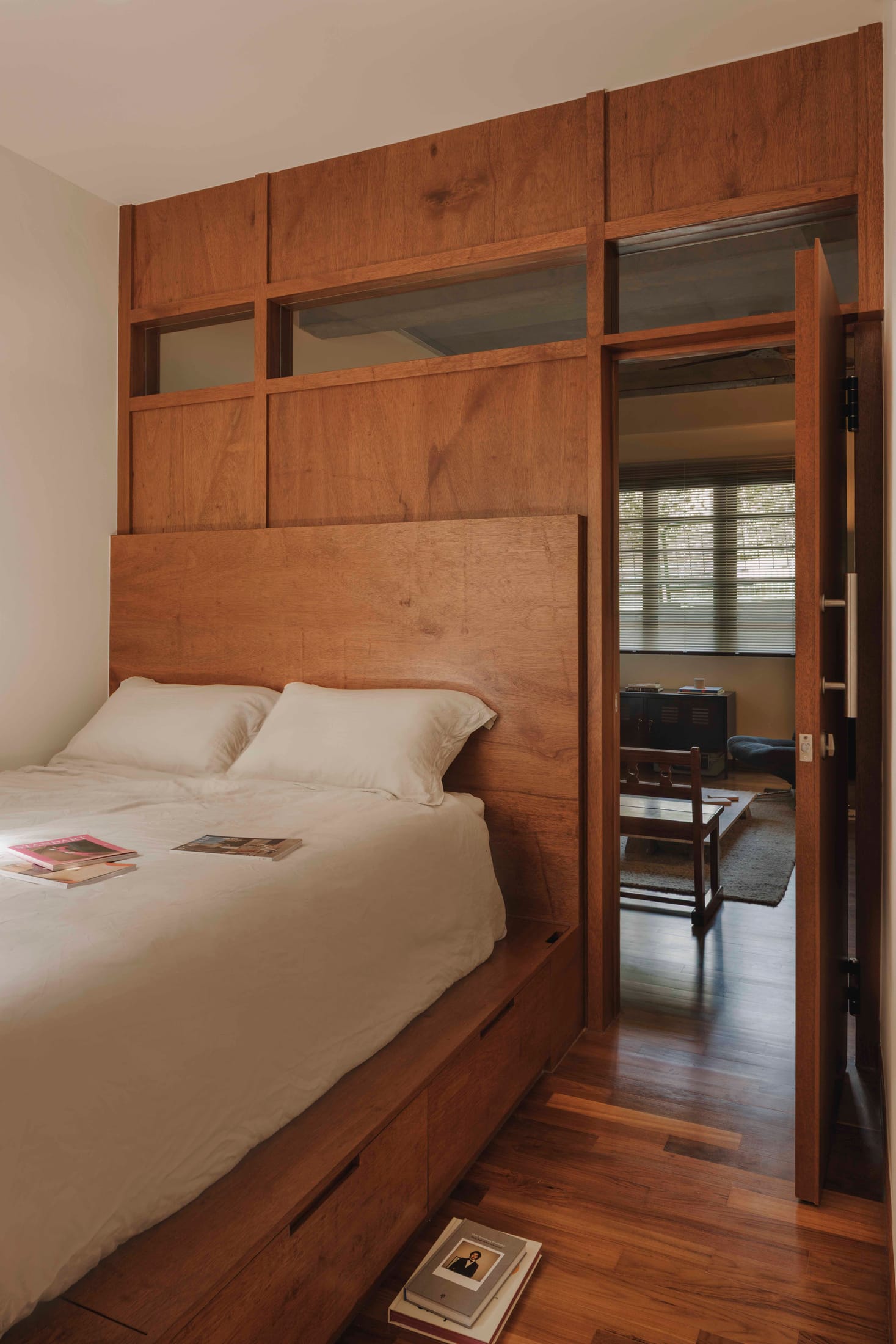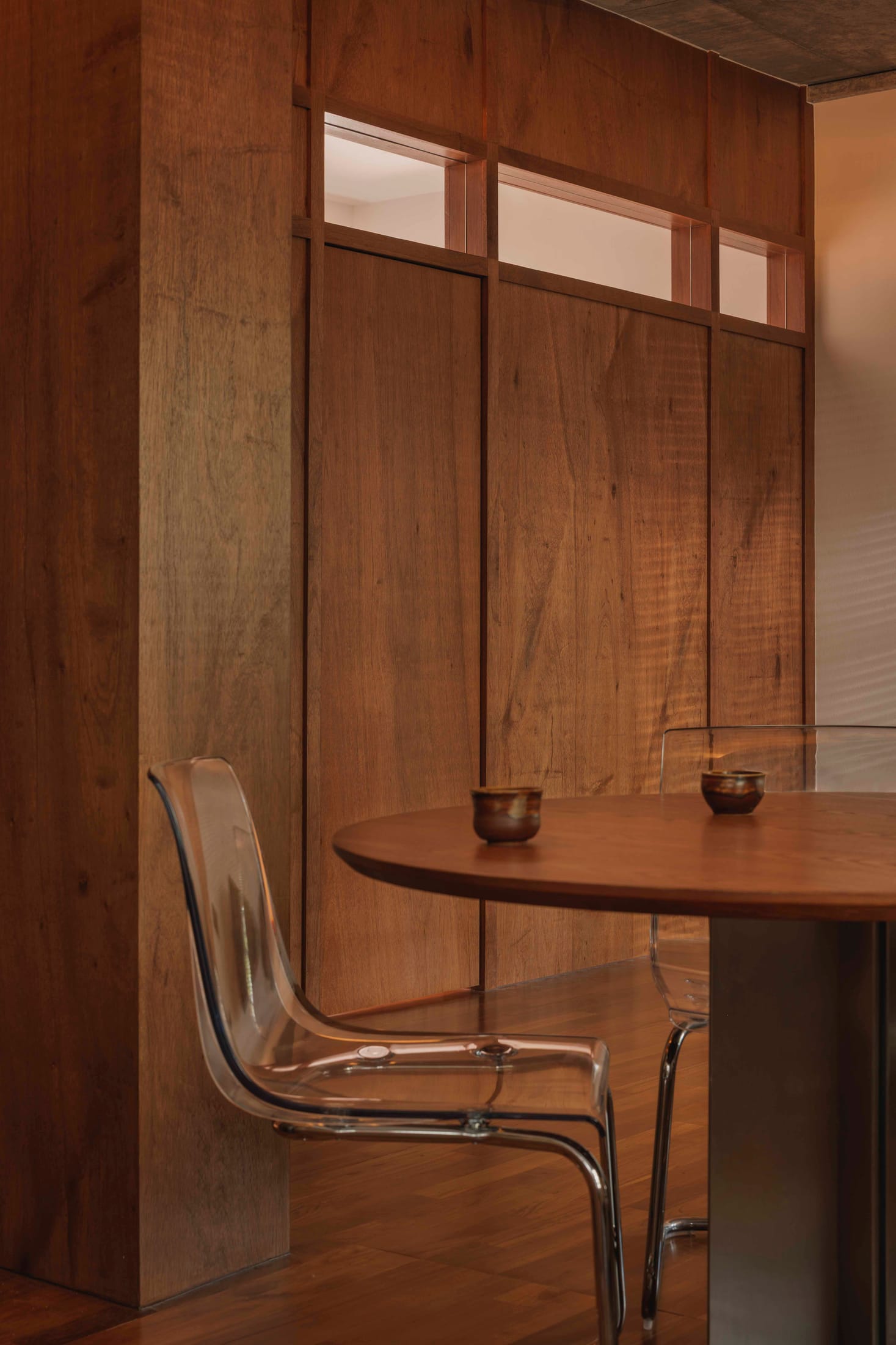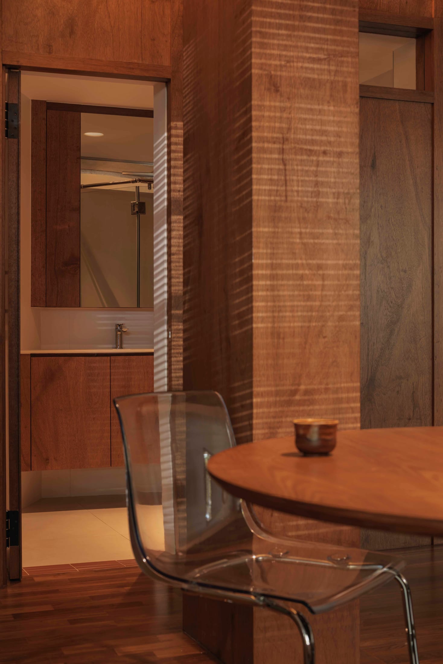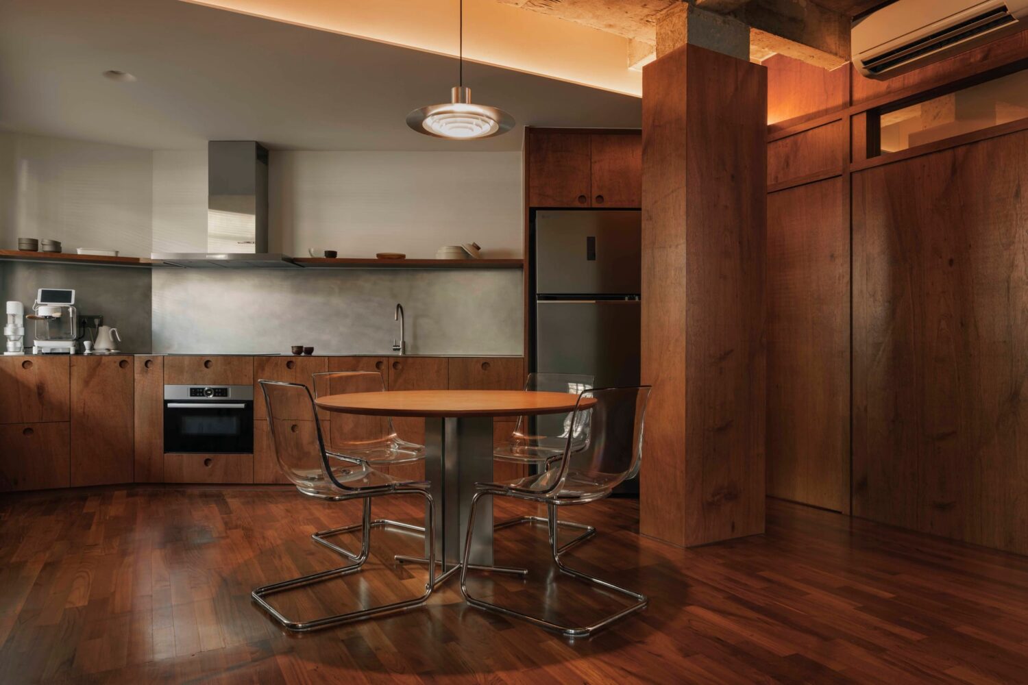 Named after the Japanese word 雨宿り (amayadori), meaning “to take shelter from the rain,” this 56 square metre Singapore apartment by Ascend Design offers a quiet retreat from the density of urban life. The concept draws on the idea of sanctuary, delivering a space that balances warmth, tactility, and restraint in equal measure.Ascend Design has approached the compact footprint with precision. The material palette centres on walnut-toned timber, brushed metal, and exposed concrete — a trio that grounds the interior without overwhelming it. Concealed cabinetry and built-in joinery work to dissolve visual clutter, allowing the inherent beauty of each material to come through.The kitchen anchors the plan, clad in stainless steel and framed by rich timber. It functions as both workspace and gathering spot, striking that balance between utility and calm that compact living demands. A round dining table paired with transparent cantilever chairs lightens the composition while maintaining intimacy — a smart move in a space where every element must earn its place.Singapore Designer Creates Experimental Home with Custom Furniture and Raw Materials.Ascend Design's Jasper Goh turned his own Singapore apartment into a creative playground, transforming constraints into design opportunities. Yellowtrace Ascend Design Amayadori House Singapore Home Photo Studio Stacked 01 Opt80 Yellowtrace Ascend Design Amayadori House Singapore Home Photo Studio Stacked 02 Opt80 Yellowtrace Ascend Design Amayadori House Singapore Home Photo Studio Stacked 03 Opt80 Yellowtrace Ascend Design Amayadori House Singapore Home Photo Studio Stacked 05 Opt80 Yellowtrace Ascend Design Amayadori House Singapore Home Photo Studio Stacked 06 Opt80 Yellowtrace Ascend Design Amayadori House Singapore Home Photo Studio Stacked 07 Opt80 Yellowtrace Ascend Design Amayadori House Singapore Home Photo Studio Stacked 08 Opt80 Yellowtrace Ascend Design Amayadori House Singapore Home Photo Studio Stacked 10 Opt80 Yellowtrace Ascend Design Amayadori House Singapore Home Photo Studio Stacked 11 Opt80 Yellowtrace Ascend Design Amayadori House Singapore Home Photo Studio Stacked 12 Opt80 Yellowtrace Ascend Design Amayadori House Singapore Home Photo Studio Stacked 13 Opt80 Yellowtrace Ascend Design Amayadori House Singapore Home Photo Studio Stacked 14 Opt80 Yellowtrace Ascend Design Amayadori House Singapore Home Photo Studio Stacked 15 Opt80 Yellowtrace Ascend Design Amayadori House Singapore Home Photo Studio Stacked 16 Opt80 Yellowtrace Ascend Design Amayadori House Singapore Home Photo Studio Stacked 17 Opt80 Yellowtrace Ascend Design Amayadori House Singapore Home Photo Studio Stacked 18 Opt80 Yellowtrace Ascend Design Amayadori House Singapore Home Photo Studio Stacked 18 Opt80 In the living area, a low sofa and bench keep sightlines open. Objects like sake bottles and art books bring a lived-in quality without tipping into clutter. Above, an exposed concrete beam runs raw against the crafted warmth of the timber envelope, a considered contrast that speaks to the design’s material honesty. Subtle lighting washes the ceiling and walls, amplifying the interplay of shadow and grain throughout the day.This project reflects Ascend Design’s core philosophy: spaces should distil life to its essentials rather than overwhelm with excess. This interior feels both modern and timeless — a home where daily rituals unfold quietly, and the architecture itself becomes a place of pause and reflection.This Berlin Apartment Defines Space Through Colour Rather Than Walls.Bruzkus Greenberg's Blue Box is a clever spatial intervention in a 75-square-metre Berlin rooftop apartment. The design centres on a multifunctional, dark blue joinery box that replaces walls and an impractical fireplace. [Images courtesy of Ascend Design. Photography by Studio Stacked.] Share the love: Share on Facebook (Opens in new window) Facebook Share on X (Opens in new window) X Share on LinkedIn (Opens in new window) LinkedIn Email a link to a friend (Opens in new window) Email Share on Pinterest (Opens in new window) Pinterest Leave a Reply Cancel ReplyYour email address will not be published.CommentName* Email* Website Δ