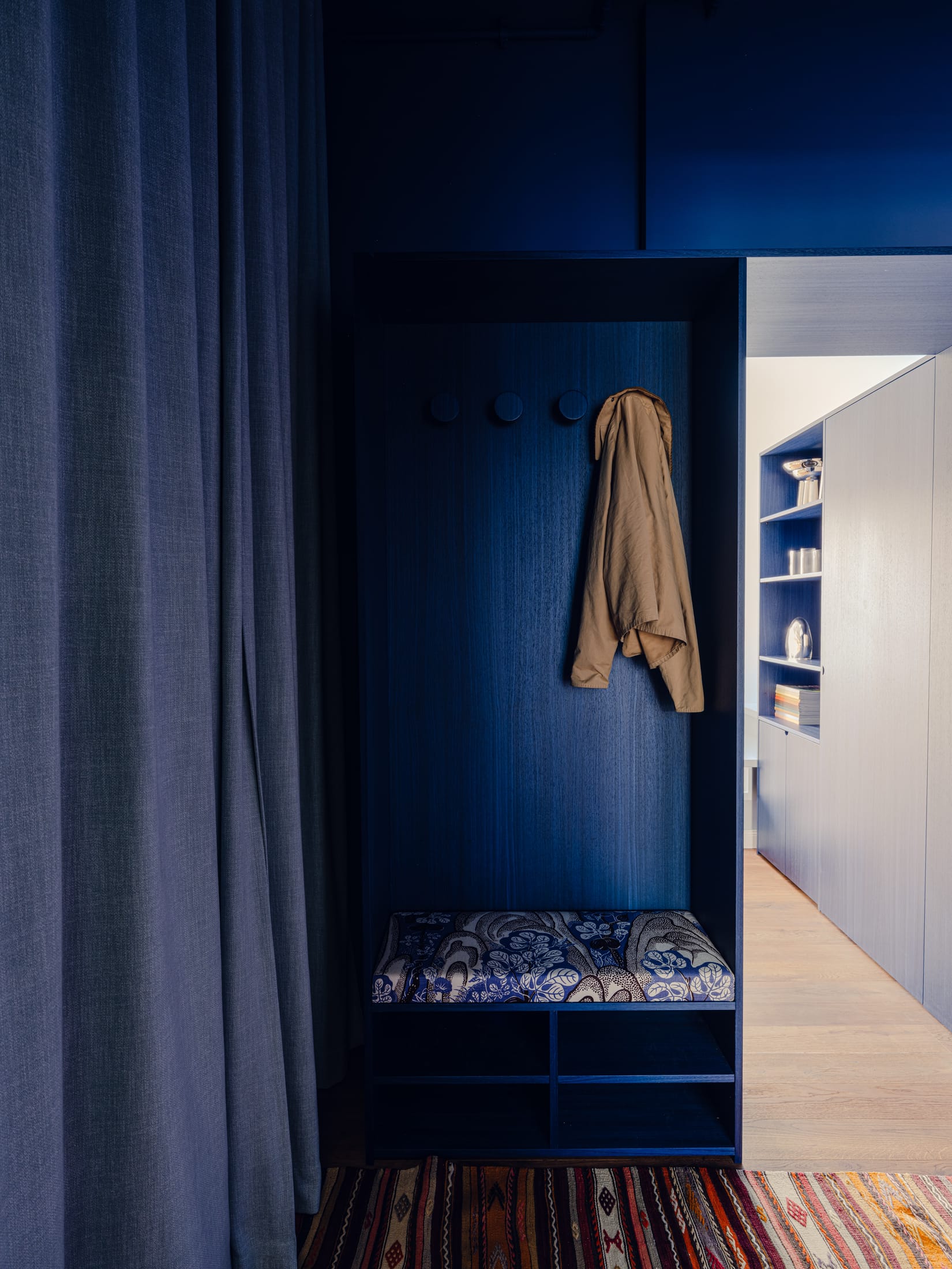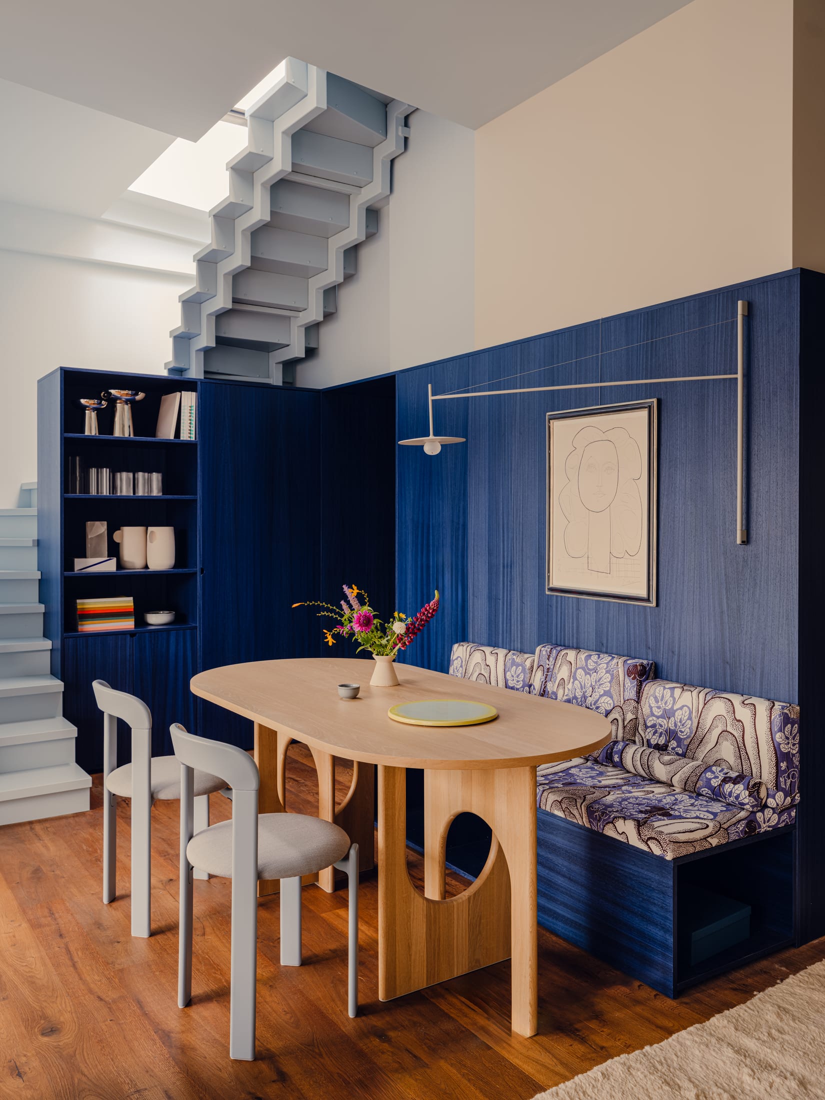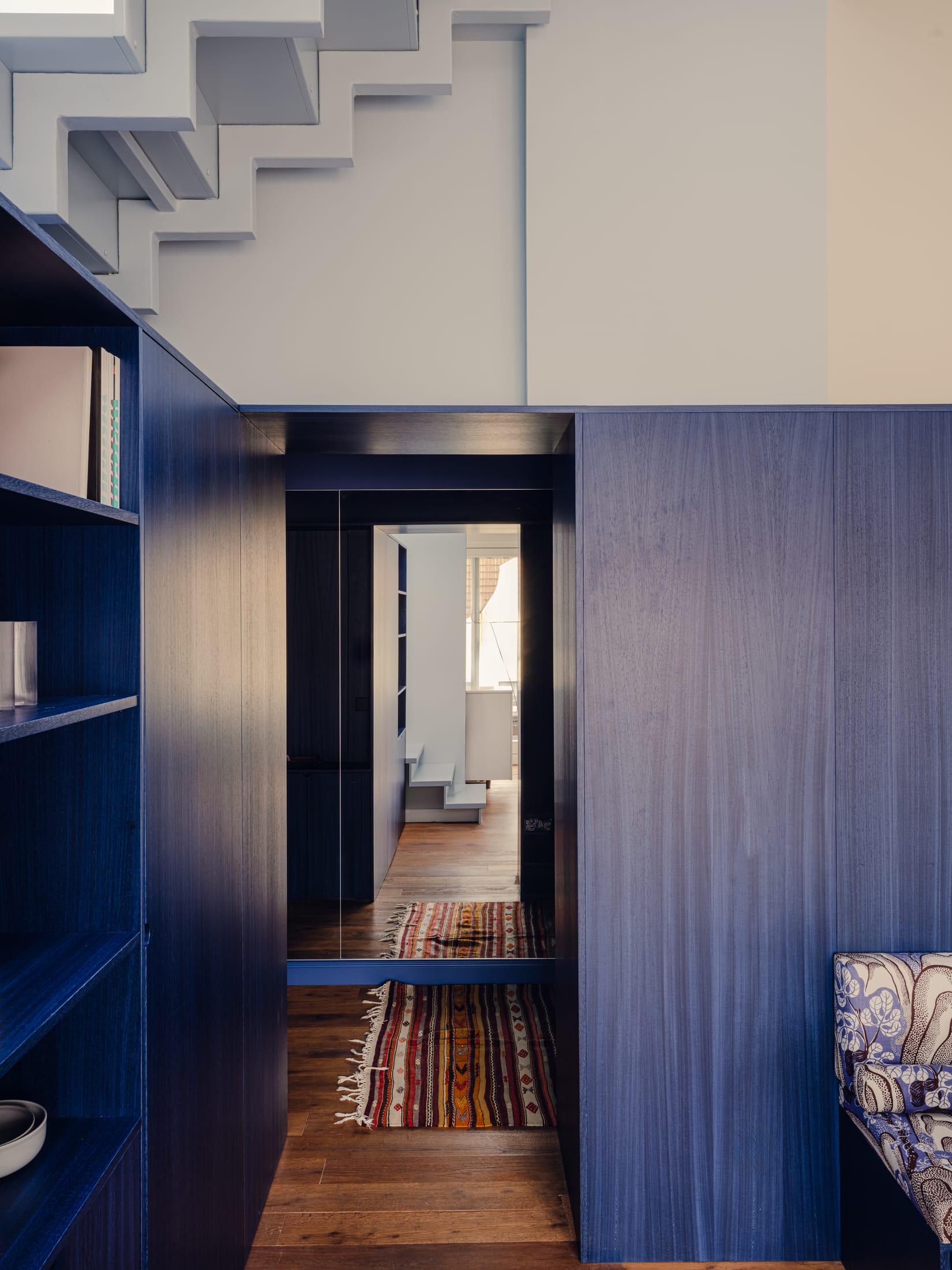Bruzkus Greenberg is back with another brilliant box trick. After their Green Box Apartment basically broke the internet with its deep green joinery magic, the Berlin studio has done it again with Blue Box—a 75-square-metre rooftop flat in Prenzlauer Berg that proves they’re masters of the box-within-a-box move.When the clients first came across the apartment, they were drawn to the way the wind moved through the space when all doors stood open. Lovely idea, except the apartment was broken up into tiny rooms with walls everywhere—including one room without a single window and a fireplace nobody wanted sitting smack in the middle of the walkway. The brief? Keep that breezy feeling, but make it actually livable.The fix? Rip out the walls and that impractical fireplace, then drop in a dark blue joinery box as the apartment’s new heart. Partners Peter Greenberg and Ester Bruzkus, working with designer Anna Kopeina, turned one joinery element into entry, dining banquette, shelving, and stair screen. “We realised that by taking the fireplace away altogether, and screening the stairs with a shelving unit, we made the dining area become the new centre of the apartment,” Greenberg explains.Studio Latino's Gutsy Design Layered Over 1970s Bones in Milan.In thi 80-square-metre apartment in Milan's buzzing Nolo,deep blue kitchen reads like a piece of statement furniture, anchoring the open-plan space with colour and character. Here’s the clever bit—the blue box sits away from the walls so you can walk around all sides. This creates an open floor plan without losing the sense of separate spaces. They also added a full-height cupboard with timber and mirrored panels that makes the apartment feel twice its size. Light blue curtains can close off the bedroom when needed or disappear completely into the joinery.The colour work is super smart. Designer Anna Kopeina puts it simply: “The light blue brings the eye vertical; the dark blue connects the spaces horizontally.” The sky blue ceiling flows across the living room, office, and bedroom, while the dark stained millwork (stained, not painted, so you see the wood grain) keeps everything grounded. It’s colour doing heavy lifting instead of walls.“A sense of lightness comes not only because there are no dividing walls, but because there is a contrasting dark core,” Greenberg observes. The entry experience exemplifies this—visitors arrive through a low, dark blue passage before emerging into a taller, brighter space topped by a skylight. The compressed entry amplifies the perception of volume in the main living area.Green Box Apartment, Berlin by Ester Bruzkus Architekten.Implementing precise planning and bold colour combinations, there is a sense of discovery around every corner in this top floor apartment in Berlin. Custom furniture reinforces the architectural concept. The bespoke butter-yellow sofa, named “Sophia 3000” and designed specifically for this project, features modular seating with equal width and depth dimensions, allowing cylindrical roll pillows to be repositioned for sitting or reclining. “The new sofa is soft AND rigid,” says Bruzkus, describing the balance between comfort and structure. FF&E procurement by Studio Coucou features a mix of vintage pieces and contemporary designs that complement the architectural palette.vThe roof terrace serves as an additional room, featuring built-in seating and offering sweeping views across Berlin. Sky blue stairs—matching the ceiling tone—connect the interior to this outdoor space, creating a gradient from the deep blue entry through the living areas to the actual sky.Before-and-after images reveal the transformation from a compartmentalised flat, where dining required sitting on either side of a structural column, to a sophisticated pied-à-terre, where spatial flow and colour define the experience. As Bruzkus reflects: “We love rooms within rooms, unconventional colour combinations, and contrasts of hard and soft.”Nailed it.Studio Karhard's Nightclub-Inspired Berlin Apartment.Twenty years after designing Berghain, Studio Karhard brings nightclub vibes home in this Berlin apartment renovation. [Images courtesy of Bruzkus Greenberg. Photography by Pion Studio.] Share the love: Click to share on Facebook (Opens in new window) Facebook Click to share on X (Opens in new window) X Click to share on LinkedIn (Opens in new window) LinkedIn Click to email a link to a friend (Opens in new window) Email Click to share on Pinterest (Opens in new window) Pinterest Leave a Reply Cancel ReplyYour email address will not be published.CommentName* Email* Website Δ