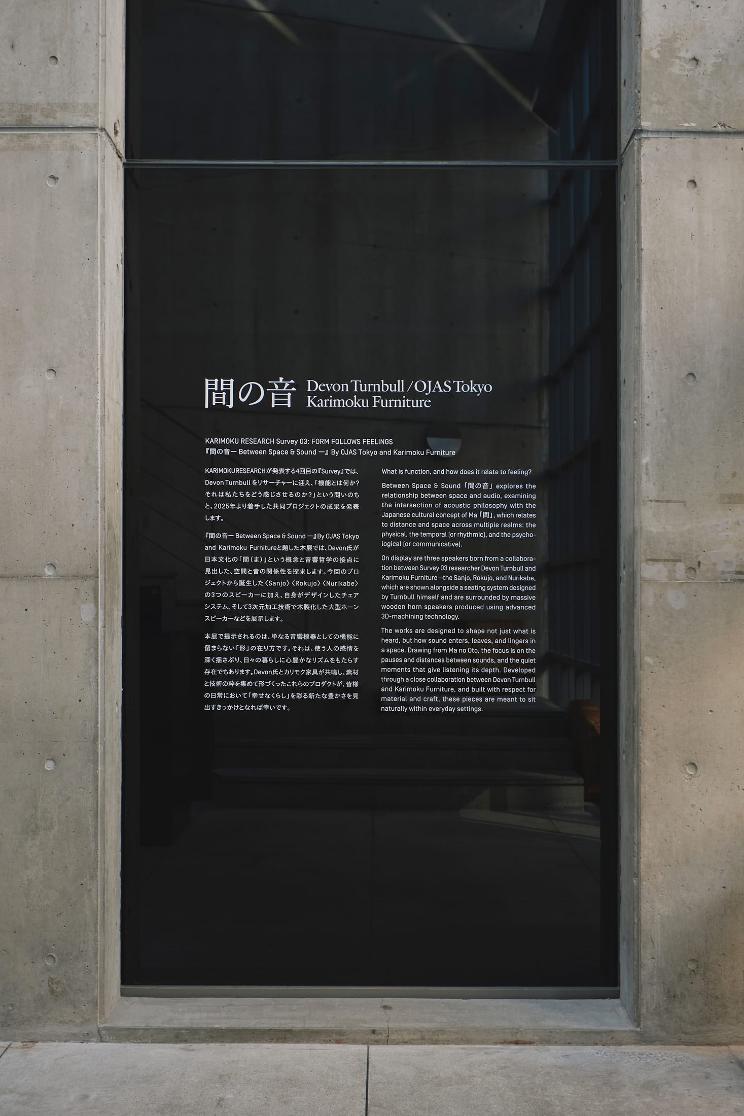 Karimoku Research—the experimental arm of one of Japan’s most respected furniture makers—has just opened its third Survey exhibition in Tokyo’s Nishiazabu district. It’s a collaboration that sits right at the intersection of sound, craft, and spatial design.Titled Between Space & Sound「間の音」(Ma no Oto), the exhibition pairs Karimoku Furniture with New York and Tokyo-based audio designer Devon Turnbull, founder of OJAS—a name you might know from his handcrafted hi-fi speaker systems installed everywhere from Supreme stores and Public Records in Brooklyn to exhibitions at SFMOMA and the Cooper Hewitt Smithsonian Design Museum.The central question driving the project is a good one: What is function, and how does it relate to feeling? Working together since 2025, Turnbull visited the Karimoku factory in Aichi, where his intricate speaker designs were translated into complex wooden curvatures through 3D-machining and hand-applied veneering techniques. Where OJAS speakers have historically been built from plywood, this collaboration pushes into oak veneer finished in either Turnbull’s signature Pewter Gray or Karimoku’s Pure Oak—both allowing the natural grain to stay visible. Yellowtrace Devon Turnbull Between Space And Sound Karimoku Research Survey Exhibition Photo Masaaki Inoue 01 Opt80 Yellowtrace Devon Turnbull Between Space And Sound Karimoku Research Survey Exhibition Photo Masaaki Inoue 02 Opt80 Yellowtrace Devon Turnbull Between Space And Sound Karimoku Research Survey Exhibition Photo Masaaki Inoue 03 Opt80 Yellowtrace Devon Turnbull Between Space And Sound Karimoku Research Survey Exhibition Photo Masaaki Inoue 04 Opt80 Yellowtrace Devon Turnbull Between Space And Sound Karimoku Research Survey Exhibition Photo Masaaki Inoue 05 Opt80 Yellowtrace Devon Turnbull Between Space And Sound Karimoku Research Survey Exhibition Photo Masaaki Inoue 06 Opt80 Yellowtrace Devon Turnbull Between Space And Sound Karimoku Research Survey Exhibition Photo Masaaki Inoue 07 Opt80 Yellowtrace Devon Turnbull Between Space And Sound Karimoku Research Survey Exhibition Photo Masaaki Inoue 08 Opt80 Yellowtrace Devon Turnbull Between Space And Sound Karimoku Research Survey Exhibition Photo Masaaki Inoue 09 Opt80 Yellowtrace Devon Turnbull Between Space And Sound Karimoku Research Survey Exhibition Photo Masaaki Inoue 10 Opt80 Yellowtrace Devon Turnbull Between Space And Sound Karimoku Research Survey Exhibition Photo Masaaki Inoue 11 Opt80 Yellowtrace Devon Turnbull Between Space And Sound Karimoku Research Survey Exhibition Photo Masaaki Inoue 11a Opt80 Yellowtrace Devon Turnbull Between Space And Sound Karimoku Research Survey Exhibition Photo Masaaki Inoue 12 Opt80 Yellowtrace Devon Turnbull Between Space And Sound Karimoku Research Survey Exhibition Photo Masaaki Inoue 13 Opt80 Yellowtrace Devon Turnbull Between Space And Sound Karimoku Research Survey Exhibition Photo Masaaki Inoue 14 Opt80 Yellowtrace Devon Turnbull Between Space And Sound Karimoku Research Survey Exhibition Photo Masaaki Inoue 15 Opt80 Yellowtrace Devon Turnbull Between Space And Sound Karimoku Research Survey Exhibition Photo Masaaki Inoue 16 Opt80 The exhibition unfolds across all three floors of the Karimoku Research Centre. The first floor features a tea room-inspired Sound House wrapped in Turnbull’s half-tone pattern, housing a pair of medium-sized Rokujo speakers for meditative listening. The second floor opens up into a communal space centred around massive Multicell Horn Speakers—Turnbull’s curved horn designs, typically realised in metal, rendered entirely in wood for the first time. The basement showcases the full collection of three speaker models—the Sanjo, Rokujo, and Nurikabe—alongside modular seating and folding acoustic panels inspired by traditional byōbu screens.What anchors the whole thing is the Japanese concept of Ma「間」—the tension and harmony that exist in the spaces between things. Sound, after all, requires space to travel through before we feel it. That philosophical thread weaves neatly through every floor, every piece, every pause between notes.The exhibition runs until 5th June 2026 at the Karimoku Research Centre, 2-24-2 Nishiazabu, Minato-ku, Tokyo.Playful and Purposeful: ESM Studio in Redfern by Olivia Bossy.With an aura of unpredictability and calm, this three-part space champions playful shapes and layouts, with a clear purpose to each design detail. Sound indulgence and immersion are cleverly brought forth into another dimension. [Images courtesy of Karimoku Research. Photography by Masaaki Inoue.] Share the love: Share on Facebook (Opens in new window) Facebook Share on X (Opens in new window) X Share on LinkedIn (Opens in new window) LinkedIn Email a link to a friend (Opens in new window) Email Share on Pinterest (Opens in new window) Pinterest Leave a Reply Cancel ReplyYour email address will not be published.CommentName* Email* Website Δ