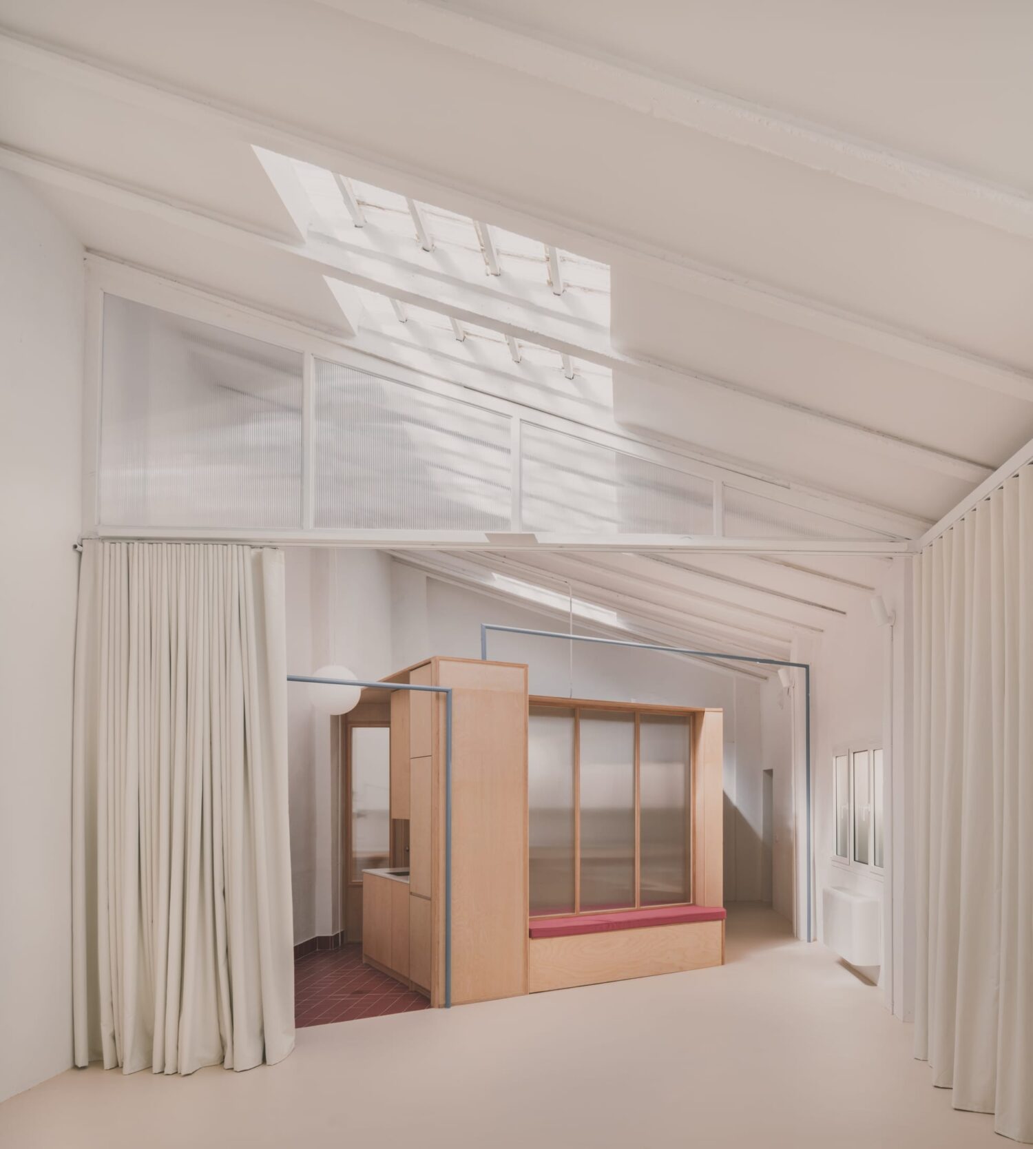 Hidden within the courtyard walls of a peripheral Madrid neighbourhood, a 1950s mechanical workshop has found new life as an artist’s sanctuary thanks to Día Uno Estudio.Dubbed Nave Maravilla, the 180-square-metre warehouse, with its characteristic concrete structure and pitched roof typical of mid-century industrial architecture, had suffered years of neglect. Rather than masking its history, architects Marta A. Rozas and Cris San José embraced the building’s raw industrial bones, creating what they describe as a “white container” that celebrates existing elements and textures.The design strategy was restrained. After treating dampness issues, the team painted the walls while preserving their original texture, allowing the building’s weathered character to shine through the clean aesthetic. A continuous microcement floor creates spatial fluidity throughout the warehouse, unifying the various functional zones while maintaining the industrial feel.The project’s most striking intervention is a freestanding birch ply and glass pavilion positioned at the warehouse’s centre. This organic insertion breaks the orthogonal rigidity of the industrial shell, creating dynamic spatial relationships while housing the artist’s private studio. The timber volume’s curved form introduces warmth and intimacy within the larger concrete container.A House of Many Faces: Warehouse Transformation in Porto by Fala Atelier.Fala Atelier turned this Porto warehouse into one massive living room, interrupted only by a single curved wall. A kitchen and monumental fireplace act as familiar landmarks, placating domesticity. Yellowtrace Dia Uno Nave Maravilla Madrid Warehouse Conversion Photo Javierde Paz Garcia 02 Opt80 Yellowtrace Dia Uno Nave Maravilla Madrid Warehouse Conversion Photo Javierde Paz Garcia 07 Opt80 Yellowtrace Dia Uno Nave Maravilla Madrid Warehouse Conversion Photo Javierde Paz Garcia 16 Opt80 Yellowtrace Dia Uno Nave Maravilla Madrid Warehouse Conversion Photo Javierde Paz Garcia 05 Opt80 Yellowtrace Dia Uno Nave Maravilla Madrid Warehouse Conversion Photo Javierde Paz Garcia 11 Opt80 Yellowtrace Dia Uno Nave Maravilla Madrid Warehouse Conversion Photo Javierde Paz Garcia 12 Opt80 Yellowtrace Dia Uno Nave Maravilla Madrid Warehouse Conversion Photo Javierde Paz Garcia 08 Opt80 Yellowtrace Dia Uno Nave Maravilla Madrid Warehouse Conversion Photo Javierde Paz Garcia 06 Opt80 Yellowtrace Dia Uno Nave Maravilla Madrid Warehouse Conversion Photo Javierde Paz Garcia 04 Opt80 Yellowtrace Dia Uno Nave Maravilla Madrid Warehouse Conversion Photo Javierde Paz Garcia 15 Opt80 Yellowtrace Dia Uno Nave Maravilla Madrid Warehouse Conversion Photo Javierde Paz Garcia 19 Opt80 Yellowtrace Dia Uno Nave Maravilla Madrid Warehouse Conversion Photo Javierde Paz Garcia 20 Opt80 Yellowtrace Dia Uno Nave Maravilla Madrid Warehouse Conversion Photo Javierde Paz Garcia 10 Opt80 Yellowtrace Dia Uno Nave Maravilla Madrid Warehouse Conversion Photo Javierde Paz Garcia 17 Opt80 Yellowtrace Dia Uno Nave Maravilla Madrid Warehouse Conversion Photo Javierde Paz Garcia 13 Opt80 Yellowtrace Dia Uno Nave Maravilla Madrid Warehouse Conversion Photo Javierde Paz Garcia 14 Opt80 Yellowtrace Dia Uno Nave Maravilla Madrid Warehouse Conversion Photo Javierde Paz Garcia 18 Opt80 Yellowtrace Dia Uno Nave Maravilla Madrid Warehouse Conversion Photo Javierde Paz Garcia 21 Opt80 Yellowtrace Dia Uno Nave Maravilla Madrid Warehouse Conversion Photo Javierde Paz Garcia 09 Opt80 Yellowtrace Dia Uno Nave Maravilla Madrid Warehouse Conversion Photo Javierde Paz Garcia 03 Opt80 On one side of the central pavilion lies the luminous private studio, while the opposite area offers flexible space adaptable to various artistic activities. A white curtain system allows for the creation of an isolated projection space, adding another layer of functionality to the adaptive design. The kitchen, office area, and service spaces complete the programme without overwhelming the open industrial character.Visual cohesion comes through material details that thread throughout the space. Custom-designed birch furniture echoes the central pavilion’s materiality, while blue metalwork accents create visual connections from interior to facade. These consistent design elements generate unity without sacrificing the building’s authentic industrial character.Día Uno’s approach to Nave Maravilla showcases the potential of thoughtful industrial restoration. By respecting the warehouse’s structural logic while introducing contemporary functionality, they’ve created a space that serves its new artistic purpose.What Dreams are Made of: Film Noir Studio in Geneva by Leopold Banchini Architects & Giona Bierens de Haan.Emerging as a modern canvas that echoes the film noir genre’s lasting allure, cinematic moments are artfully lit by oversized (moon) lights that cast an ethereal glow, turning empty corners and alleyways into a canvas for noir-inspired tales. [Images courtesy of Día Uno Estudio. Photography by Javier de Paz García.] Share the love: Click to share on Facebook (Opens in new window) Facebook Click to share on X (Opens in new window) X Click to share on LinkedIn (Opens in new window) LinkedIn Click to email a link to a friend (Opens in new window) Email Click to share on Pinterest (Opens in new window) Pinterest Leave a Reply Cancel ReplyYour email address will not be published.CommentName* Email* Website Δ