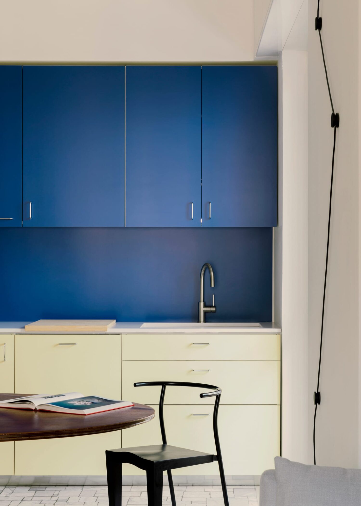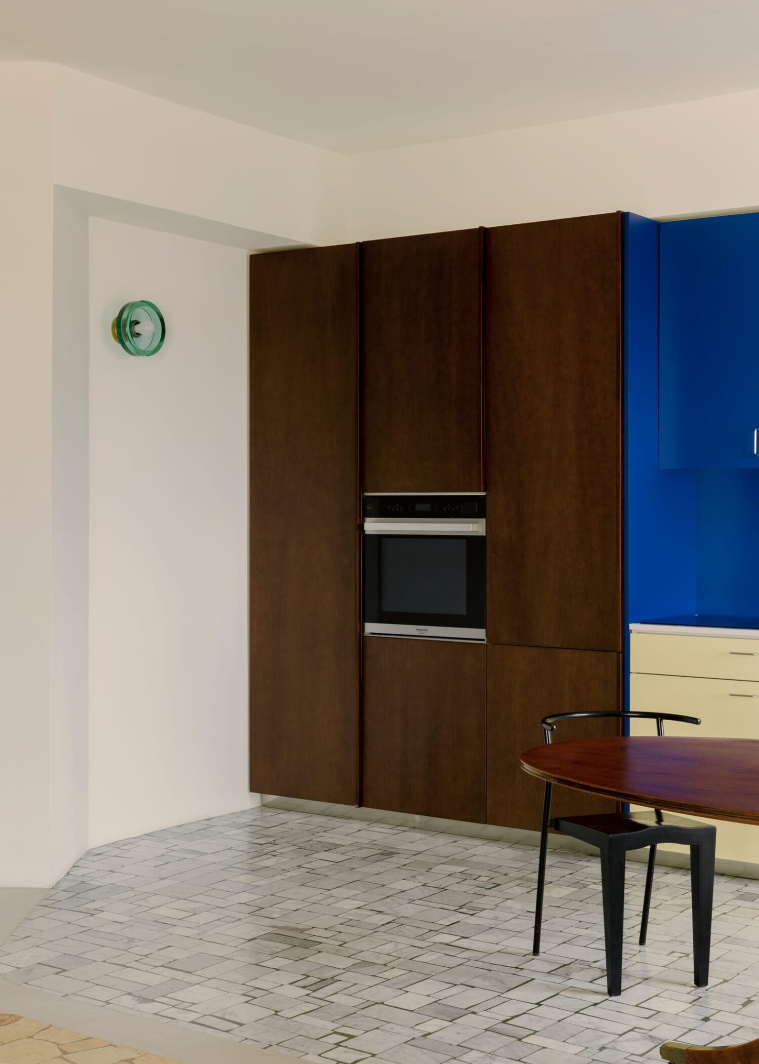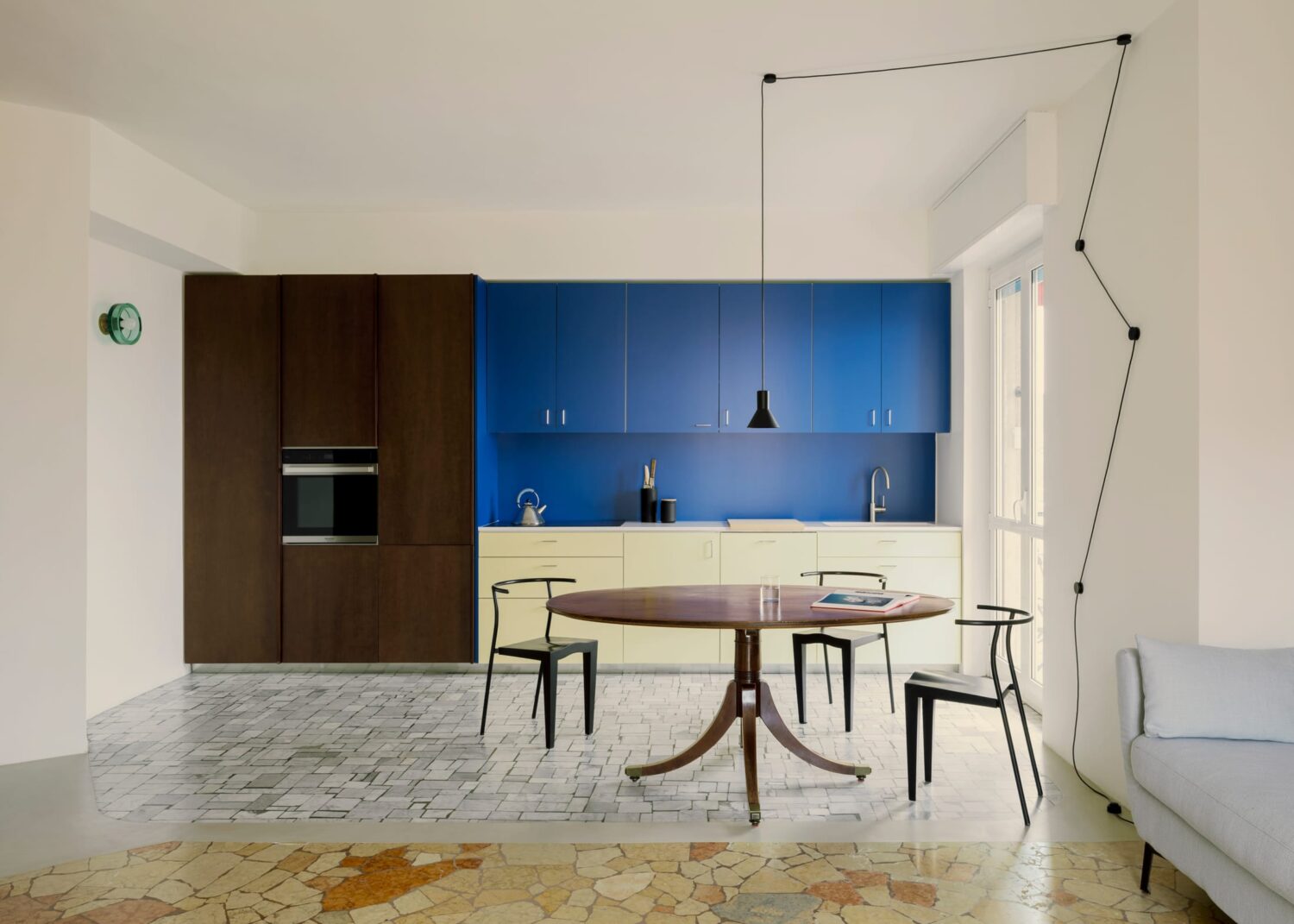 In Milan’s buzzing Nolo neighbourhood, Studio Latino has given an 80-square-metre 1970s apartment a new lease on life. The brief was simple: create a home for a young couple in publishing, expecting their first child, while honouring the building’s Milanese character.Rather than gut the place, Studio Latino worked with what was already there. The original Palladiana floors in the living spaces and industrial parquet in the bedrooms stayed put, becoming the foundation for everything else. Old wall partitions remain visible too, creating a layered effect where you can read the apartment’s history.“Our intent with this project was to recreate a romantic and eclectic space, a perfect place in the city to get great inspiration for new and successful novels,” explain the designers.The real showstopper is the kitchen. Rendered in vibrant blue and pale lemon, it’s far more than a functional space—it reads like a piece of statement furniture, a bold sculptural presence that anchors the open-plan living area. This isn’t a kitchen trying to blend in; it’s a kitchen with personality, bringing colour and character to what could have been a neutral backdrop.Brutalist 1960s Milan Apartment Reimagined by ESA Studio.Emilio Scarano creates a cinematic narrative through space with pure material and absence of decor, rejecting open-plan living for something far more intriguing. Yellowtrace Studio Latino Cavalcanti Milan Apartment Renovation Photo Nicolo Panzeri 01 Opt80 Yellowtrace Studio Latino Cavalcanti Milan Apartment Renovation Photo Nicolo Panzeri 08 Opt80 Yellowtrace Studio Latino Cavalcanti Milan Apartment Renovation Photo Nicolo Panzeri 10 Opt80 Yellowtrace Studio Latino Cavalcanti Milan Apartment Renovation Photo Nicolo Panzeri 12 Opt80 Yellowtrace Studio Latino Cavalcanti Milan Apartment Renovation Photo Nicolo Panzeri 16 Opt80 Yellowtrace Studio Latino Cavalcanti Milan Apartment Renovation Photo Nicolo Panzeri 04 Opt80 Yellowtrace Studio Latino Cavalcanti Milan Apartment Renovation Photo Nicolo Panzeri 14 Opt80 Yellowtrace Studio Latino Cavalcanti Milan Apartment Renovation Photo Nicolo Panzeri 13 Opt80 Yellowtrace Studio Latino Cavalcanti Milan Apartment Renovation Photo Nicolo Panzeri 03 Opt80 Yellowtrace Studio Latino Cavalcanti Milan Apartment Renovation Photo Nicolo Panzeri 02 Opt80 Yellowtrace Studio Latino Cavalcanti Milan Apartment Renovation Photo Nicolo Panzeri 05 Opt80 Yellowtrace Studio Latino Cavalcanti Milan Apartment Renovation Photo Nicolo Panzeri 06 Opt80 Yellowtrace Studio Latino Cavalcanti Milan Apartment Renovation Photo Nicolo Panzeri 07 Opt80 Yellowtrace Studio Latino Cavalcanti Milan Apartment Renovation Photo Nicolo Panzeri 09 Opt80 Yellowtrace Studio Latino Cavalcanti Milan Apartment Renovation Photo Nicolo Panzeri 15 Opt80 Yellowtrace Studio Latino Cavalcanti Milan Apartment Renovation Photo Nicolo Panzeri 11 Opt80That same confident use of colour continues throughout. A rounded column painted in rusty orange adds warmth, whilst a custom green wall lamp by Studio Latino punctuates the kitchen zone. The palette is brave without being loud.The custom library is another smart move. Built in light wood and rust orange with ribbed glass panels, it divides the living and sleeping areas while keeping sight lines open. It’s both storage and architecture.In the bedroom, vintage pieces soften the mood, while the bathroom brings back the colour with green glazed tiles—a nod to Milan’s distinctive 1970s facades. Everything custom—kitchen, library, closet, bathroom furniture—was made by Studio Latino, mixed with Kartell chairs, Davide Groppi and Flos lighting, and vintage finds.The project succeeds in creating a space that feels both rooted in its Milanese context and ready for contemporary family life.Terrazzo, Steel, and Memory: Reimagining Caccia Dominioni's Legacy in Milan.What would Caccia Dominioni do if redesigning his own work for today's living? This question guided Tenet's renovation of a 100-square-metre apartment in Milan's Mondelli building. [Images courtesy of Studio Latino. Photography by Nicolò Panzeri.] Share the love: Click to share on Facebook (Opens in new window) Facebook Click to share on X (Opens in new window) X Click to share on LinkedIn (Opens in new window) LinkedIn Click to email a link to a friend (Opens in new window) Email Click to share on Pinterest (Opens in new window) Pinterest Leave a Reply Cancel ReplyYour email address will not be published.CommentName* Email* Website Δ