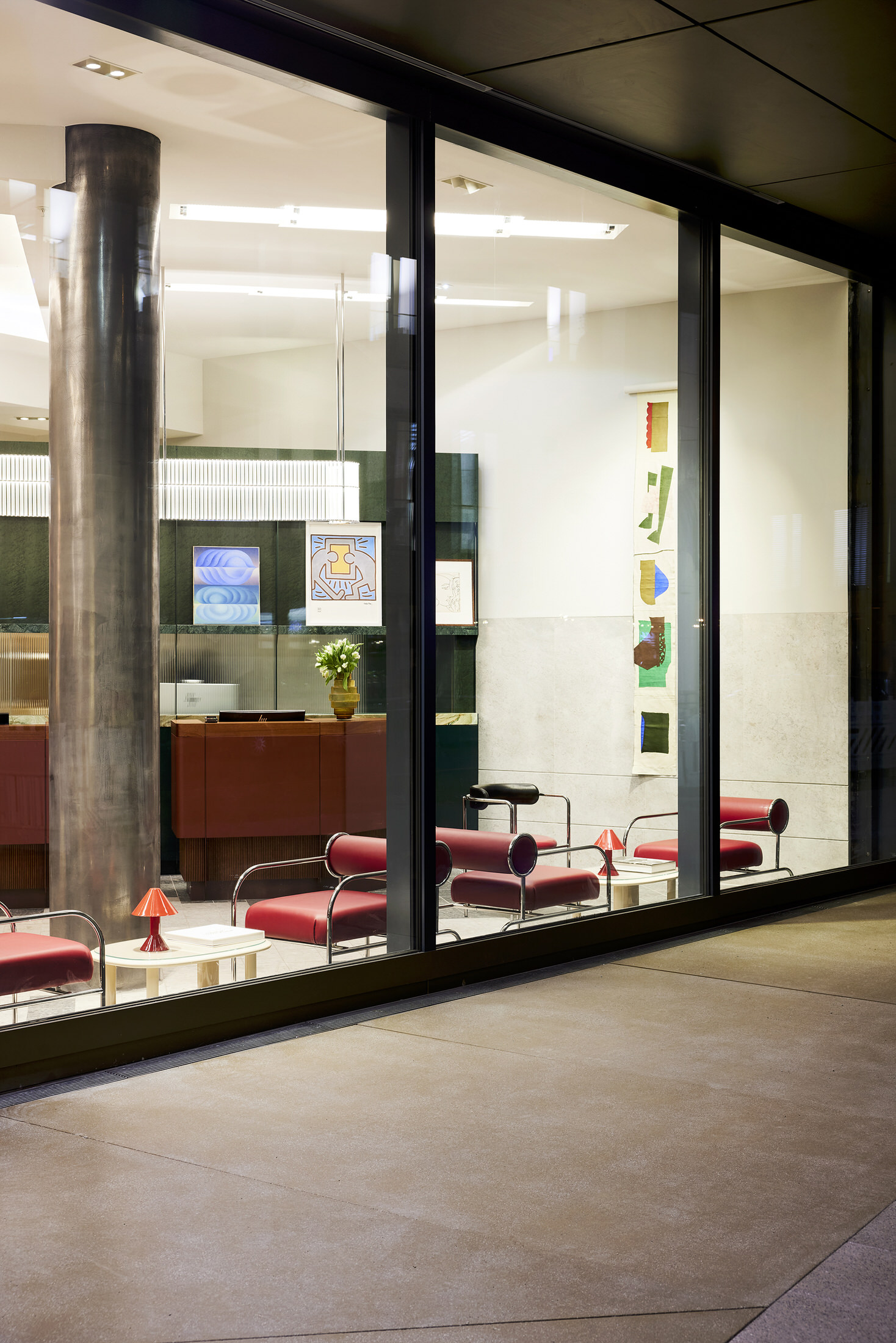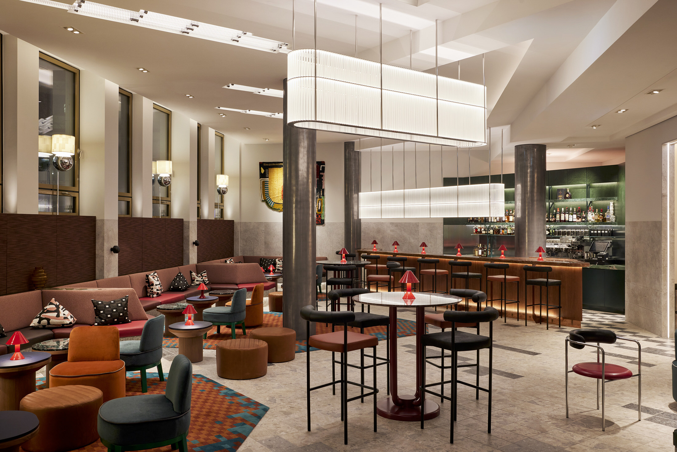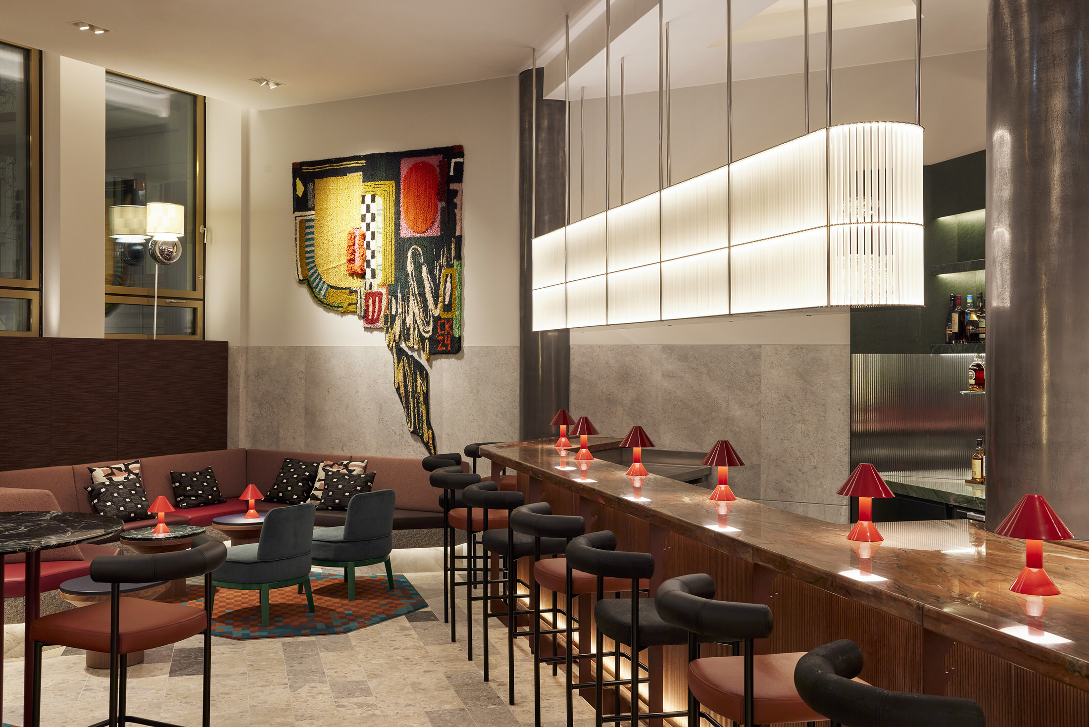 London-based architecture studio Waldo Works has completed the transformation of the former Deutsche Bank headquarters into the striking Kimpton Main Frankfurt. The hotel is located within the FOUR towers development in the city’s financial district, and spreads over 8,240 square metres.Under the direction of Tom Bartlett, Waldo Works has crafted a contemporary interpretation of Bauhaus principles whilst respecting the site’s institutional heritage. The design team approached the 155-room hotel as an exercise in contrasts, balancing cool, neutral materials like chrome and crystal against warm, opulent elements including deep green and red marble, rich velvet, and dark mahogany wood.This material interplay is immediately evident in the reception area, where bespoke desks made from leather, mahogany, aluminium and copper create striking focal points. Custom glass and nickel light fittings by Illumination Works complement screens rendered in marble, glass and green veneer, establishing the hotel’s aesthetic from the moment guests arrive.Television Centre Penthouse in London by Waldo Works.Taking lead from the post-war origins of the building, the designers followed a concept of British modernity imbued with eclectic colours and objects, with particular inspiration taken from the 1951 Festival of Britain. The lobby bar MAY continues this material narrative with a mahogany, marble and copper bar topped by a custom crystal and nickel glass holder. Signature enamelled Kimpton Frankfurt table lamps provide intimate lighting, while banquettes upholstered in leather and textile feature Tibor Fabric accents. Textile art pieces by New York-based Caroline Kaufman add a contemporary touch, complemented by lighting inspired by Dan Flavin that glows warmly throughout the evening hours.ANNI, the hotel’s 85-cover brasserie restaurant, pays homage to Bauhaus textile artist Anni Albers through its embroidered textile signage and design philosophy. Drawing inspiration from classic European grand cafés and traditional Italian restaurants in New York, the space features oversized paper lampshades, yellow grasscloth wall coverings, and elm panelling with tiled columns. Artist Zebedee Helm has contributed a collection of caricatures depicting famous Franks, adding local cultural references to the walls.Studio Ford Celebrates Legendary Women of Bauhaus with Hand-Blocked Textiles.With each block-printed design in Interwoven, an integral woman of the Bauhaus is acknowledged from Gunta Stölzl and Anni Albers to Otti Berger and Benita Koch-Otte. The guest rooms showcase attention to detail through indigo-dyed veneer and velvet headboards, green enamelled custom lighting, and tobacco leather bedside tables featuring distinctive knuckleduster handles. Desks integrate into headboard designs, cantilevering out in blue saddle-stitched leather, while custom chrome conical desk lamps span dramatically from desktop to ceiling.Bathrooms demonstrate functional innovation through red and blue taps that simplify operation for international guests, alongside glazed vanity surfaces, marble elements, and fine enamelled gridding on walls. Alabaster lighting creates a warm, welcoming atmosphere throughout these private spaces.The hotel’s art collection, curated by Laura Bartlett Studio, includes collages by Monika Gardyla, wall reliefs by Ruairiadh O’Connell, and photographs by Jenny van Sommers, reinforcing the property’s commitment to contemporary creative expression within its historically significant setting.Puro Poznań's Craft Renaissance: A Love Letter to Polish Heritage.From the sculptural reception desk to Art Nouveau-inspired glass windows, each element tells a story of local artisanship while creating thoroughly modern spaces for today's travellers. [Images courtesy of Waldo Works. Photography by Sebastian Arlt.] Share the love: Click to share on Facebook (Opens in new window) Facebook Click to share on X (Opens in new window) X Click to share on LinkedIn (Opens in new window) LinkedIn Click to email a link to a friend (Opens in new window) Email Click to share on Pinterest (Opens in new window) Pinterest Leave a Reply Cancel ReplyYour email address will not be published.CommentName* Email* Website Δ